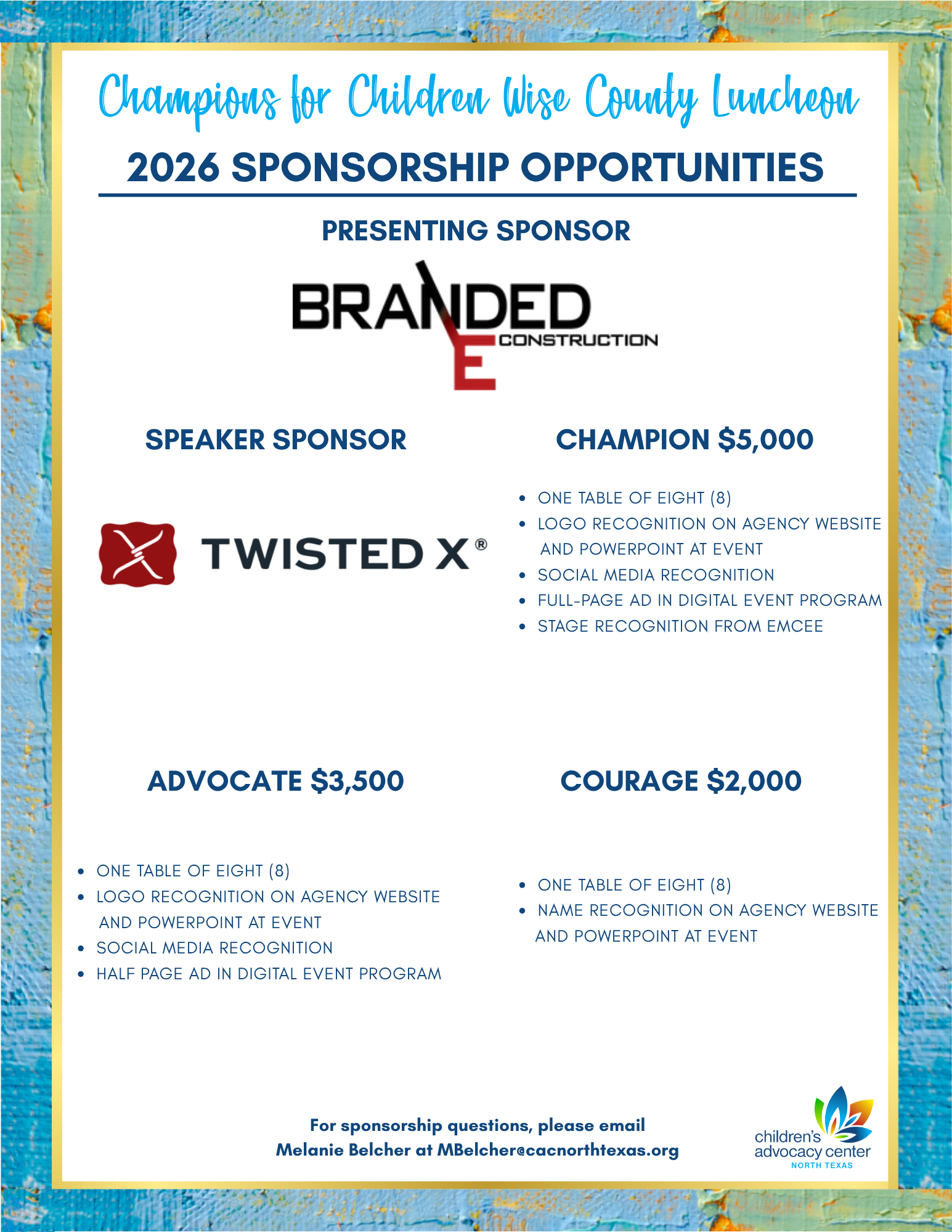 Please email any sponsorship questions to Melanie Belcher at